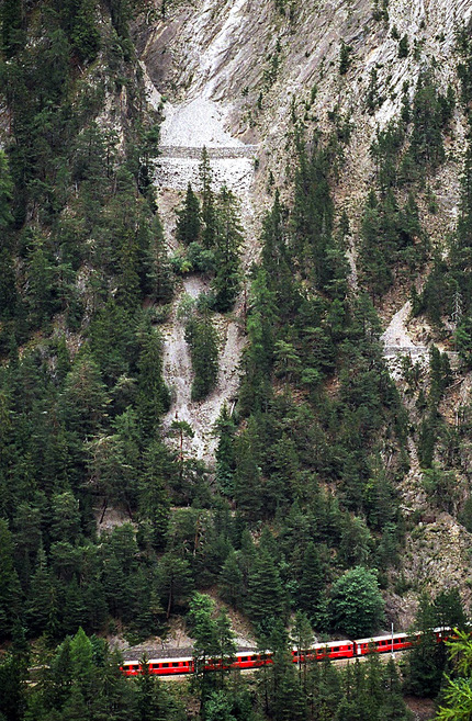 Auf der Strecke Filisur-Bergün wird die RhB von unzähligen Schutzbauten vor Steinschlag geschützt – unter anderem von dieser massiven Mauer (in der oberen Bildhälfte), welche niedergehende Steine auffängt.
