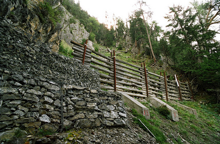 Steinschlag-Schutzpalisade aus Holz auf dem Gebiet der Gemeinde Filisur.