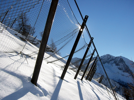 Leichtbau-Lawinenverbauung aus Drahtseilnetzen. (Sauze di Cesana, Piemont).
