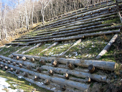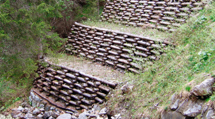 Eine Holzkasten-Verbauung soll so lange einen Hang stabilisieren, bis sich die Vegetation wieder etabliert hat, und die Bäume mit ihrem Wurzelwerk die stabilisierende Funktion übernehmen können.