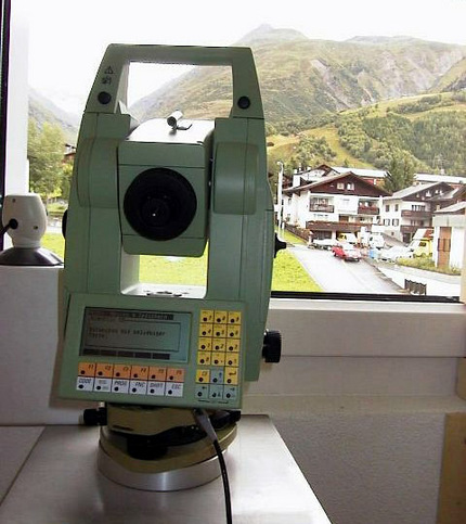 Messen, ohne das Haus zu verlassen Tachymeter im Gebäude der Alptransit in Sedrun. Im Hintergrund oberhalb der Häuser die Rutschmasse des Cuolm da Vi, auf der drei Messpfeiler stehen, die der Tachymeter vermisst.