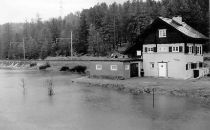 November 2002: Hochwasser in Celerina (Bernina Staz). Dank dem erhöhten Standort bleibt das Gebäude trocken.