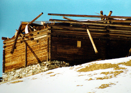 Giebellos. Im Dezember 1989 reisst ein Sturm einem Stall auf dem Gebiet der Gemeinde Trun das Dach weg.