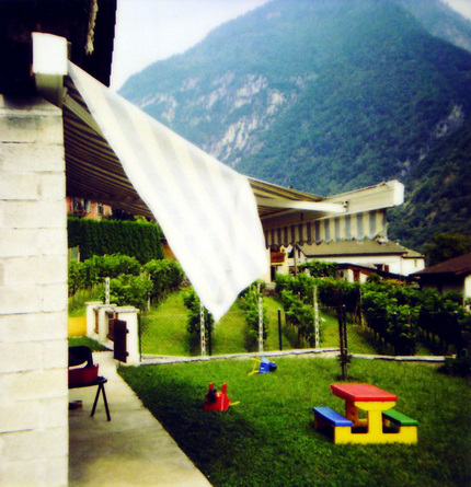 Leggia, 1997. Sturmschaden an einem Sonnenstoren eines Wohnhauses.
