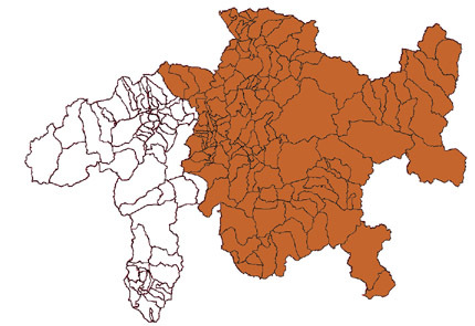 Gemeinden, welche zur Erdbebenzone Z2 gehören (mit brauner Farbe markiert). Erdbebenzonenkarte der Schweiz – Ausschnitt Graubünden.