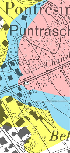 Beispiel für ein Gebiet mit Gefahrenstufe Rot (sowie Gelb und Blau) aus der Gemeinde Pontresina