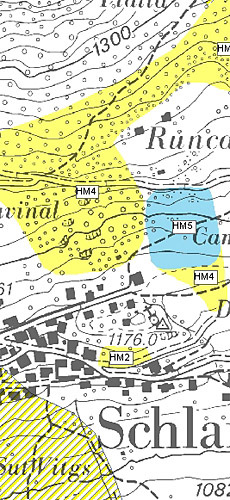 Beispiel für ein Gebiet mit Gefahrenstufe Gelb (sowie Blau) in der Gemeinde Schlans