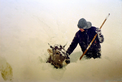 Nicht nur Menschen werden evakuiert, auch das Vieh wird aus der Gefahrenzone weggebracht (Vals, 5. April 1975).