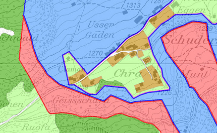 Beispiel für eine rote Gefahrenzone bezüglich Rutschungen und Hangmuren (Gemeinde Schuders).