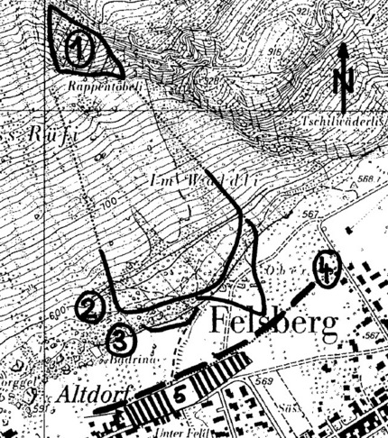 Plan / Quelle Deflorin, R., Tschirky, A., Rageth, M.: Jahrhundertsturz Felsberg. Amt für Wald und Naturgefahren Graubünden, Faktenblatt Nr. 8, Dezember 2001.