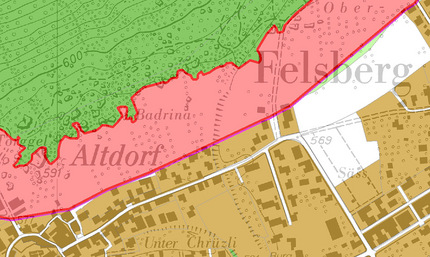 Beispiel für eine rote Gefahrenzone bezüglich den Sturzprozessen Steinschlag, Felssturz und Bergsturz (Gemeinde Felsberg).