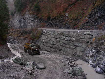 Dieses Foto zeigt einen Blockwurf im Schraubachtal (Gemeinde Schiers). Die Mauer schützt die Böschung der Waldstrasse vor dem Abtrag durch den Schraubach.