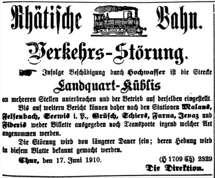 Natürlicherweise haben auch Telegraph und Telephon grosse Störungen erlitten. So war also von Landquart bis KübIis jeder Verkehr abgeschnitten. Erst am 25. VI. konnte die Postverwaltung für die Dauer der Unterbrechung des Bahnverkehrs einen Postbotendienst von Pardisla über Grüsch, Schiers, Buchen, Putz, Luzein, Küblis einrichten und Anfangs Juli dann auf der Landstrasse von Landquart bis Küblis, nachdem Strasse und Brücken nothdürftig hergestellt waren.