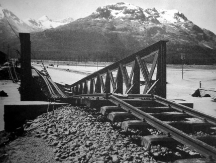 Zerstörte Eisenbahnbrücke bei Samedan.