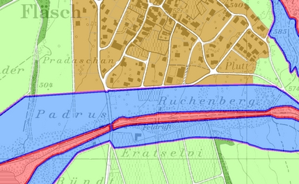 Beispiel für eine rote Gefahrenzone bezüglich Hochwasser-Gefährdung in einem Gefahrenzonenplan (Gemeinde Fläsch).