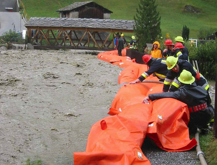 Beaver-Schläuche in Vals, 2003. Mit diesen Schläuchen gelingt es der Feuerwehr, das Wasser des Peilerbaches vom Dorf fernzuhalten.