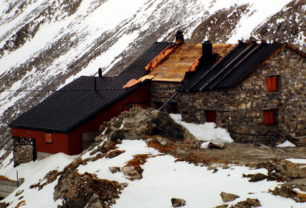 Oha! Hier hat sich die Kontrolle bezüglich Sturmschäden gelohnt: Schwer beschädigtes Kupferdach der SAC-Clubhütte »Caverdiras» nach einem Sturm im Februar 1990.