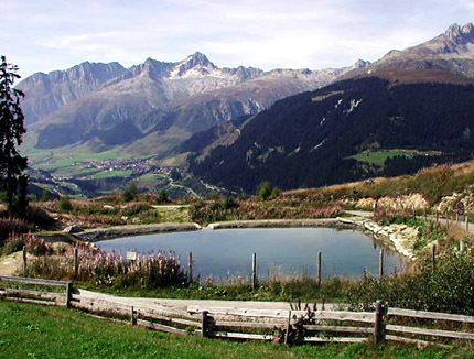 Künstlich angelegter Löschwasserteich in Stagias (Gemeinde Disentis/Mustér).