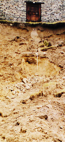 Vor dem Abgrund. Vor einem Haus hat sich eine Rutschung gelöst (Soazza, 2002)