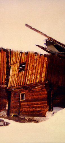 Sturmschäden an einem Stall in Ruschein (Februar 1990).