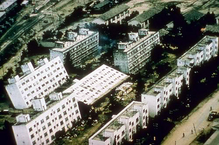 16. Juni 1964: Erdbeben in Niigata, Japan, Magnitude 7.4. Die Bodenbewegungen haben dazu geführt, dass der Untergrund «schwach geworden ist» und dem Gewicht der Häuser nachgegeben hat.